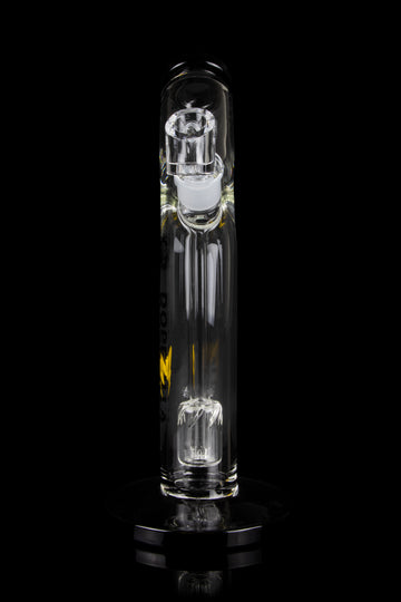 Made with handblown 5 mm thick borosilicate glass, this piece features a straight tube shape with a long bent neck which acts as a splash guard. The mouthpiece and the base have colored accents and the monster logo sits at the neck. Banshee has a drum percolator that makes hits super-smooth.