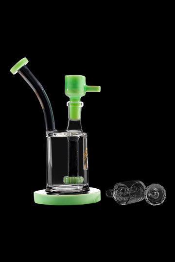 This rig has a 14.5mm female joint and a fixed downstem that leads to a showerhead percolator for smoothing your rips. The rig comes in an attractive box that includes a 14.5mm male quartz banger with a diamond-cut carb cab and a 14.5mm male flower bowl.